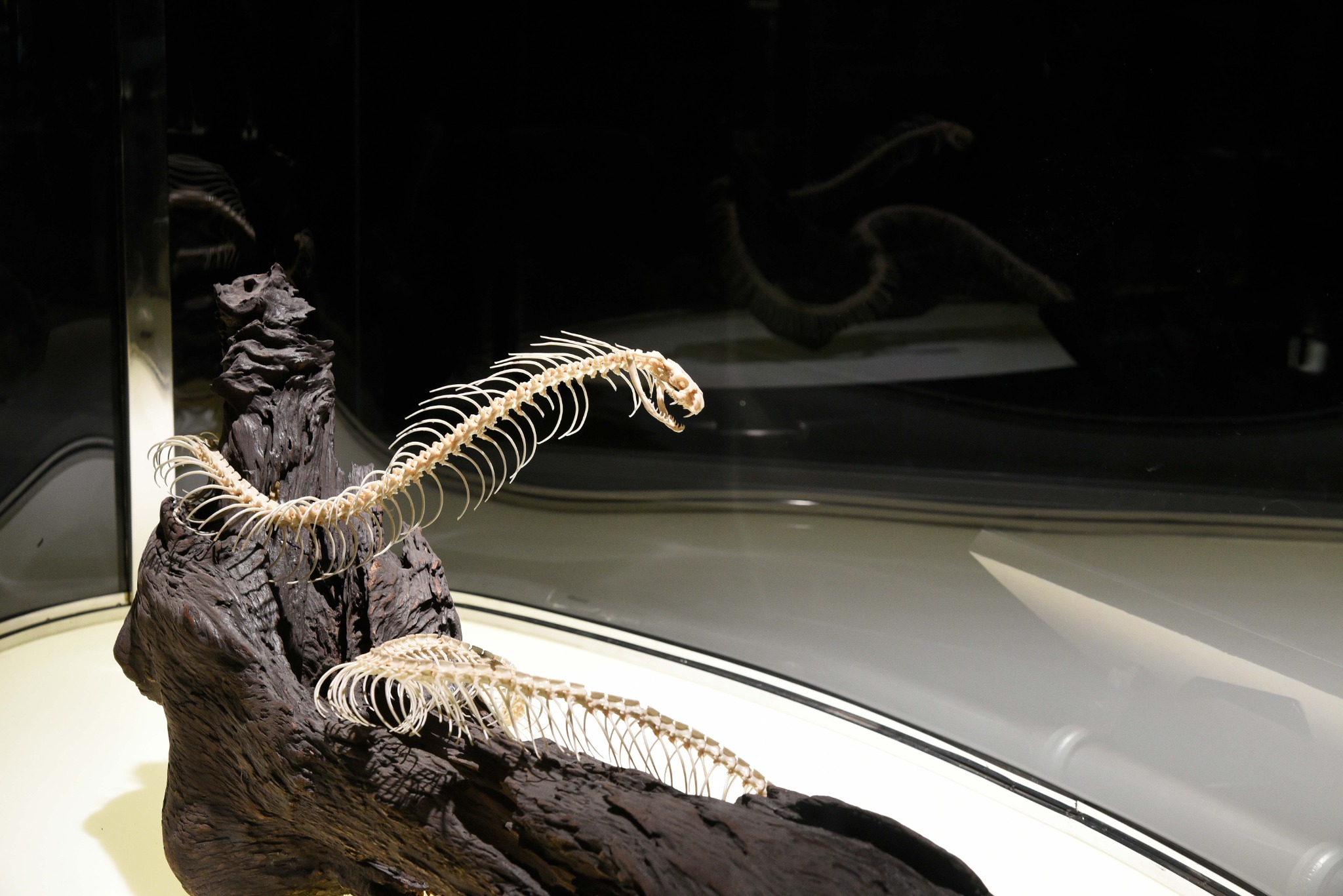 เริ่มอินแล้วจะอยากรีบเข้า “ตึก ๔ มะเสง” อาคารพิพิธภัณฑ์ที่จัดแสดงเนื้อหาเชิงวิชาการ ออกแบบบรรยากาศภายในให้เย็น-แสงสลัว สร้างความรู้สึกให้ผู้มาเยือนคล้ายกำลังลอดเข้ารัง-โพรงรกครึ้มสู่ “บ้านของงู” ทำความรู้จักกับงูมีชีวิตทั้งพันธุ์แปลก บ้างมีเฉพาะถิ่น อย่างงูกะปะ งูเห่าภูเขา งูเขียวปากแหนบงูเขียวกาบหมาก ฯลฯ แล้วตื่นตาต่อด้วยโครงกระดูก กายวิภาค ชีววิทยา ตู้ฟักไข่ ฯลฯ