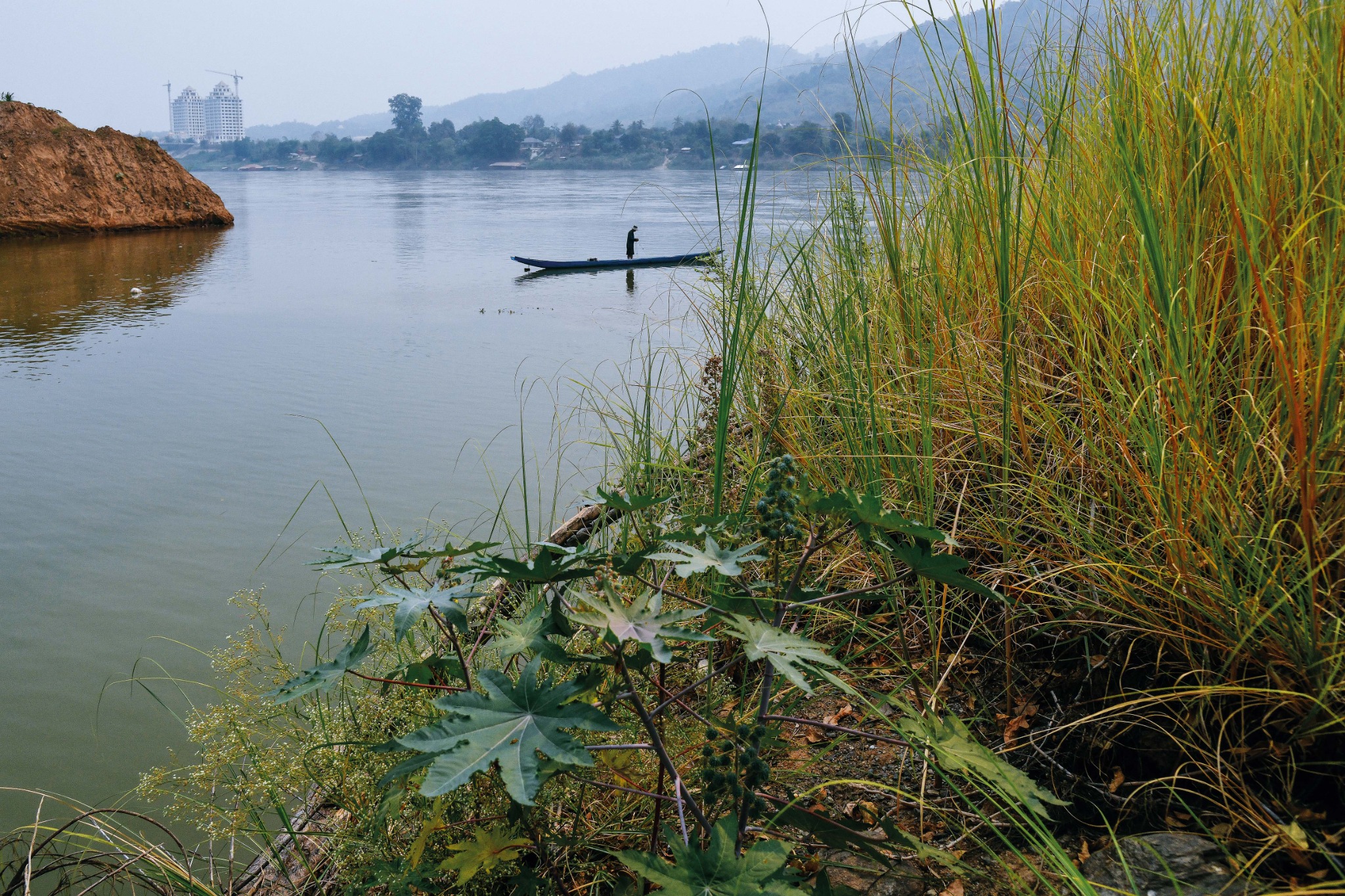 ปากน้ำอิงจุดที่แม่น้ำอิงไหลลงแม่น้ำโขง มองเห็นหมู่ตึกคิงส์โรมันส์ (Kings Romans) ในเขตเศรษฐกิจพิเศษสามเหลี่ยมทองคำใน สปป. ลาว ริมตลิ่งหลังการขุดลอกแม่น้ำ พืชท้องถิ่นถูกแทนที่ด้วยพืชต่างถิ่น เช่น ละหุ่ง