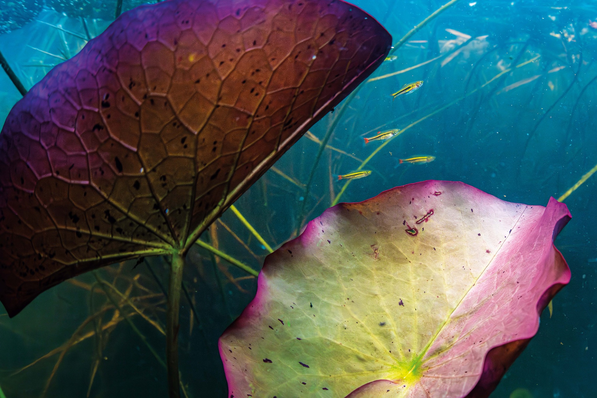 ใบบัวแผ่นบางพลิ้วไหวอย่างอิสระอยู่กึ่งกลางความลึก คล้ายกับจะบอกว่าที่จริงมันไม่ได้ต้องการผิวน้ำรองรับหรอก เส้นหลอดเล็ก ๆ โค้งอ่อนของก้านบัวเป็นเหมือนรยางค์ของสิ่งมีชีวิตที่เราไม่เคยรู้จัก กระจุกใบเรียวเล็กบนปลายยอดของดงต้นหญ้าตาปู (Eriocaulon sp.) สะท้อนแสงเรืองรองราวกับใครจัดแสงไว้ให้ ใบเรียวยาวของพืชน้ำลอยตามแนวดิ่ง เรียงรายเหมือนม่านปกปิดสิ่งที่ซ่อนอยู่ในความมืด ไกลออกไปจากสายตาฝูงปลาตัวจิ๋วว่ายซิกแซ็กตัดหน้าผ่านไปอย่างรวดเร็ว