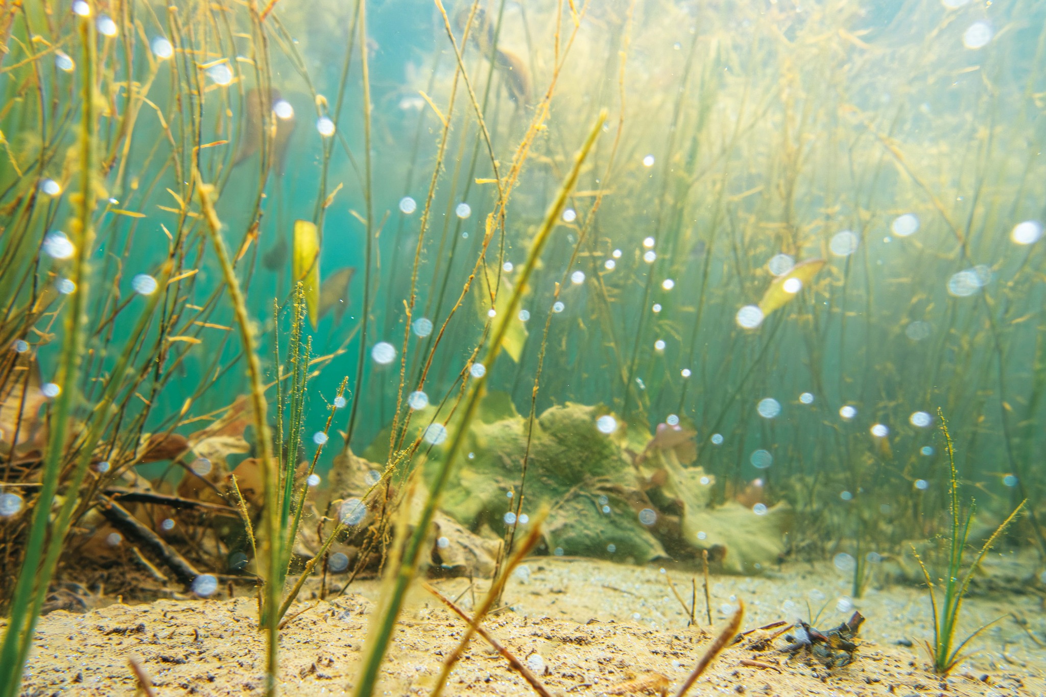 ฟองอากาศเกาะตามพืชใต้น้ำมาจากการสังเคราะห์แสงของพืช ซึ่งมีส่วนช่วยเพิ่มปริมาณออกซิเจนให้พืชและสัตว์น้ำใช้หายใจ