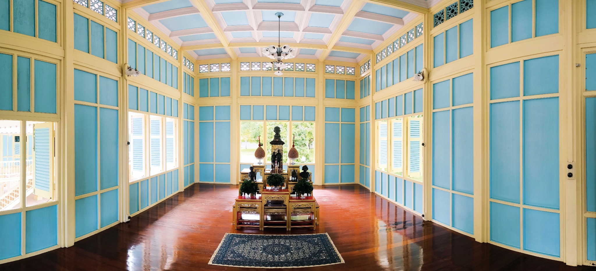 ขณะเดินกลับ เราสังเกตว่าโถงทางเดินและหอเสวยนั้นทาสีเขียวมะกอก ต่างจากห้องอื่น ๆ ที่ทาสีเหลือง-ฟ้า เกล้ามาศคลายความสงสัยว่าเกิดจากการเปรียบเทียบภาพถ่ายขาวดำของพระที่นั่งฯ ในรัชสมัยกับภาพถ่ายขาวดำของหมู่พระที่นั่งที่บูรณะหลังสุด พบว่าสีในภาพต่างกันมาก  ระหว่างบูรณะสถาปนิกอนุรักษ์และช่างสีจึงได้ขูดสีบางจุดออกเป็นชั้น ๆ เพื่อหาสีดั้งเดิม แล้วส่งตัวอย่างสีที่ขูดชั้นต่าง ๆ ให้สถาบันวิจัยแสงซินโครตรอนตรวจ พบว่าสีดั้งเดิมเมื่อ ๑๐๐ ปีก่อนไม่ใช่สีเหลือง-ฟ้า แต่น่าจะเป็นสีเขียวมะกอก เหลืองมัสตาร์ด ขาวหม่น