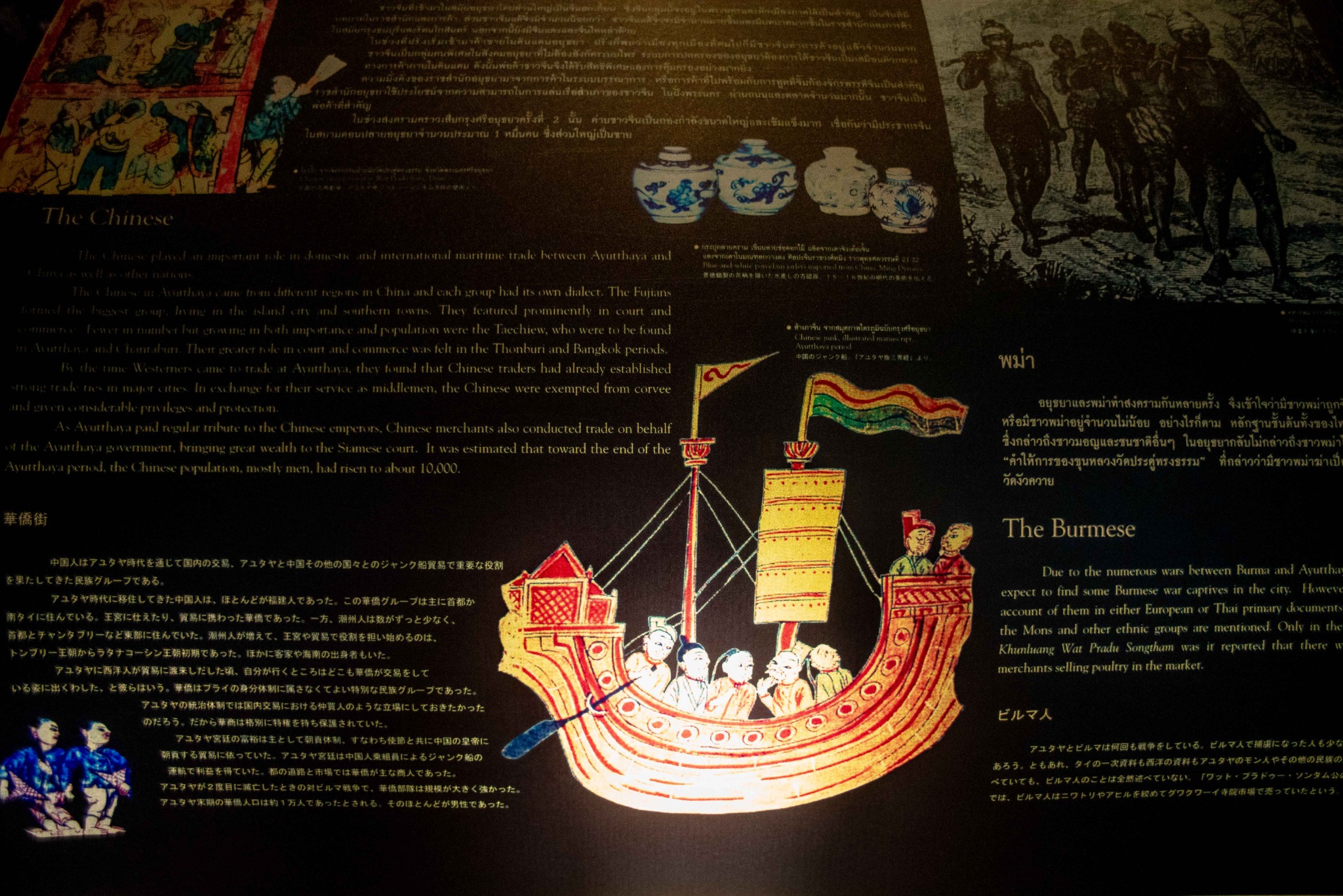 ในอาคารมีภาพวาดเรือสำเภาสยามและสิ่งจัดแสดงประดามี อย่างไหสังคโลก สมุนไพร หนังสัตว์ ผ้าบิงกะตะ ฯลฯ ซึ่งสะท้อนสภาพสังคมและเศรษฐกิจที่เคยเฟื่องฟูสมัยอยุธยา มีชุดเกราะซามูไรในสภาพสมบูรณ์ทั้ง “โยโรอิ” เสื้อหุ้มเกราะ