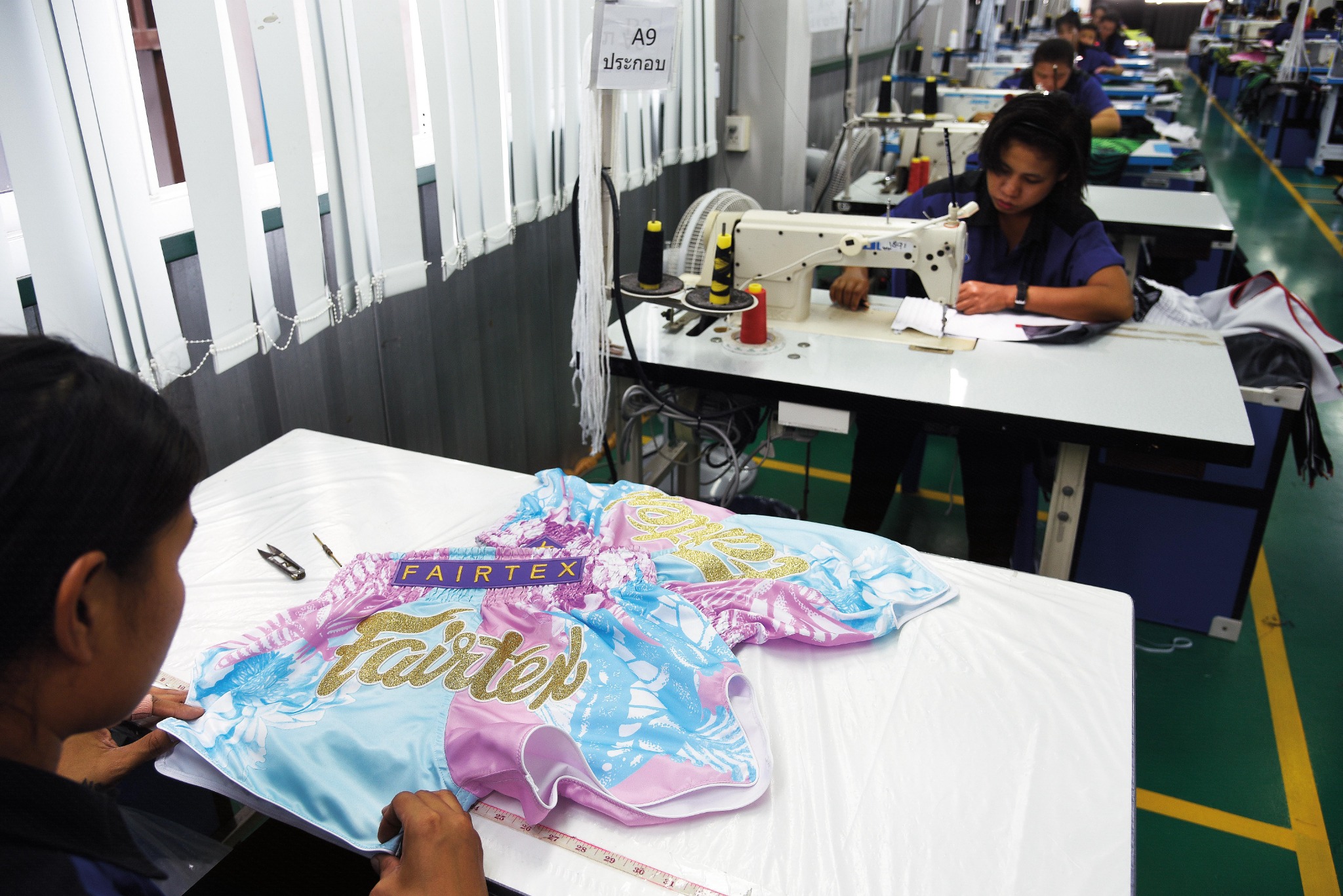 “สมัยก่อนการผลิตกางเกงมวยไทยใช้แรงงานคนเยอะ พึ่งพาทักษะฝีมือของพนักงาน อักษรไทยแต่ละตัวบนกางเกงต้องตัดด้วยมือ เสร็จแล้วทากาว ตากแดด ก่อนขึ้นจักรเย็บ ไม่ว่าจะเป็นลวดลายเปลวเพลิง โค้งขนาดไหนก็ต้องตัดด้วยมือทั้งหมด แต่ปัจจุบันกางเกงมวยไทยกลายเป็นสินค้ายอดนิยม ความต้องการของผู้บริโภคเพิ่มสูงขึ้นมาก ก็ค่อย ๆ วิวัฒนาการ จากทุกอย่างเคยทำด้วยมือ กลายเป็น mass production ผลิตจำนวนมาก ๆ