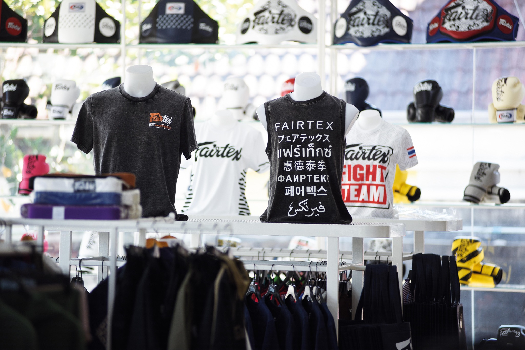 สินค้าหลากหลายหมวด ทั้งกีฬาและเครื่องแต่งกาย  ภายใน Fairtex Pro Shop สาขาสุวรรณภูมิ สมุทรปราการ