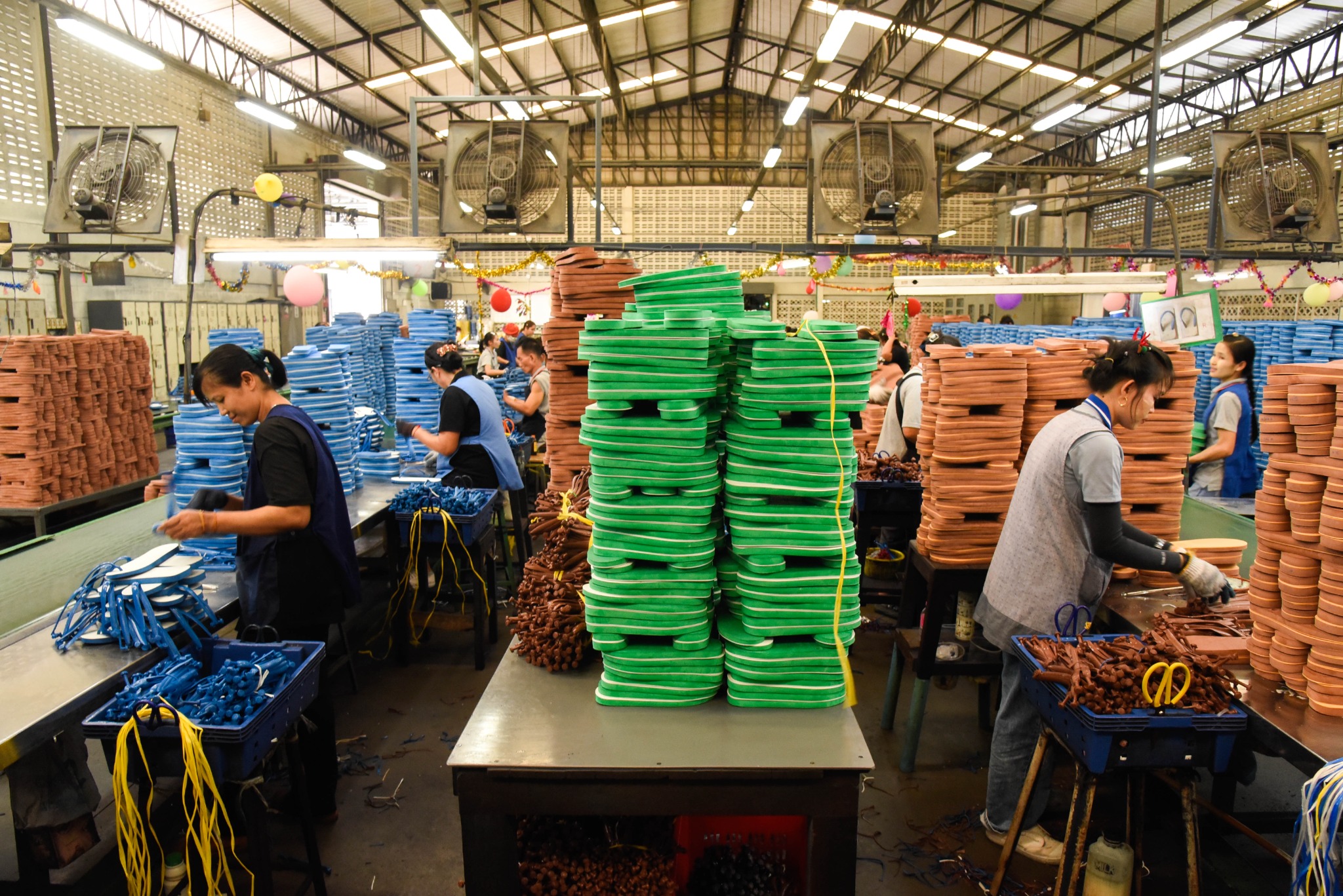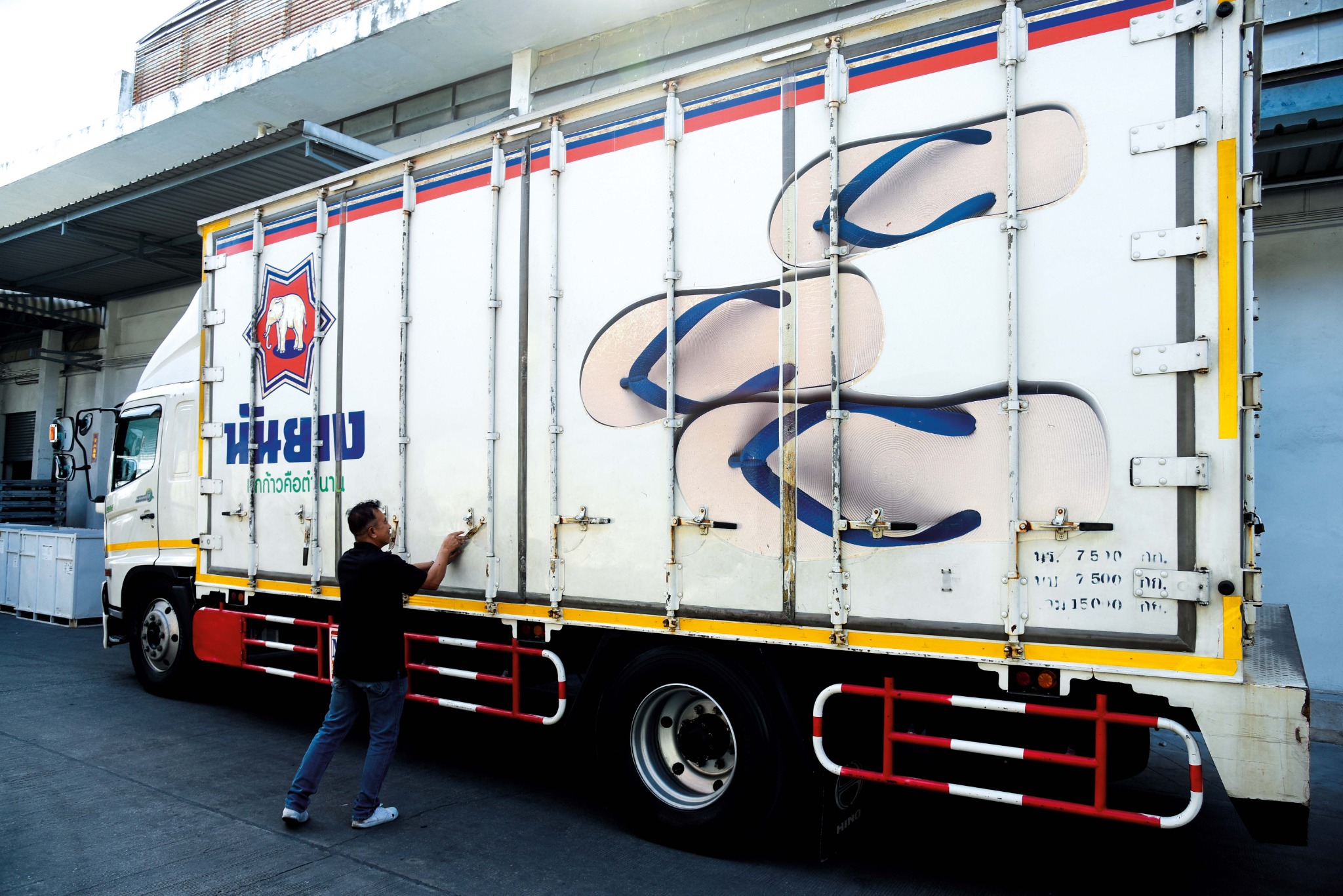 รองเท้าผ้าใบนันยางและรองเท้าแตะช้างดาว ขนส่งด้วยรถสิบล้อหลายคันจากโรงงานย่านบางแค สู่ศูนย์กระจายสินค้าย่านบางหว้า ก่อนส่งต่อไปยังร้านค้าทั่วประเทศ