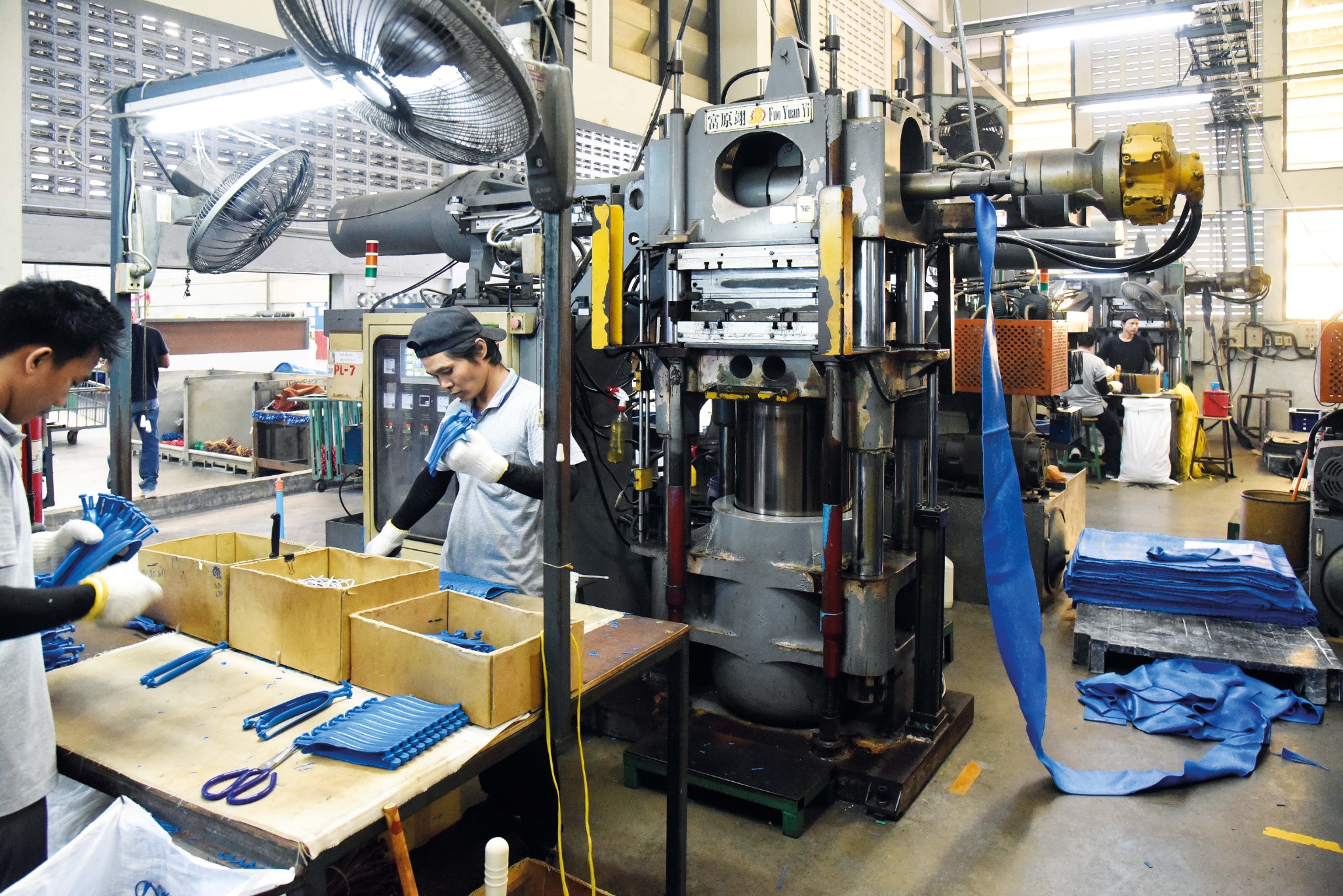 แผ่นยางแปรรูปส่งเข้าเครื่องจักรเพื่อปั๊มเป็นหูหนีบพิมพ์ลายสระอิ เอกลักษณ์ของรองเท้าแตะช้างดาว