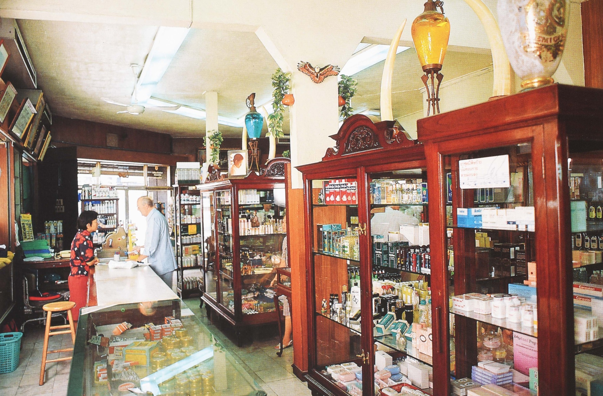 บรรยากาศตู้แสดงสินค้าภายในห้างขายยาอังกฤษ (ตรางู) ยุคบุกเบิก ซึ่งปัจจุบันทายาทแป้งเย็นตรางูรุ่นที่ ๓ ยังคงเก็บรักษาไว้