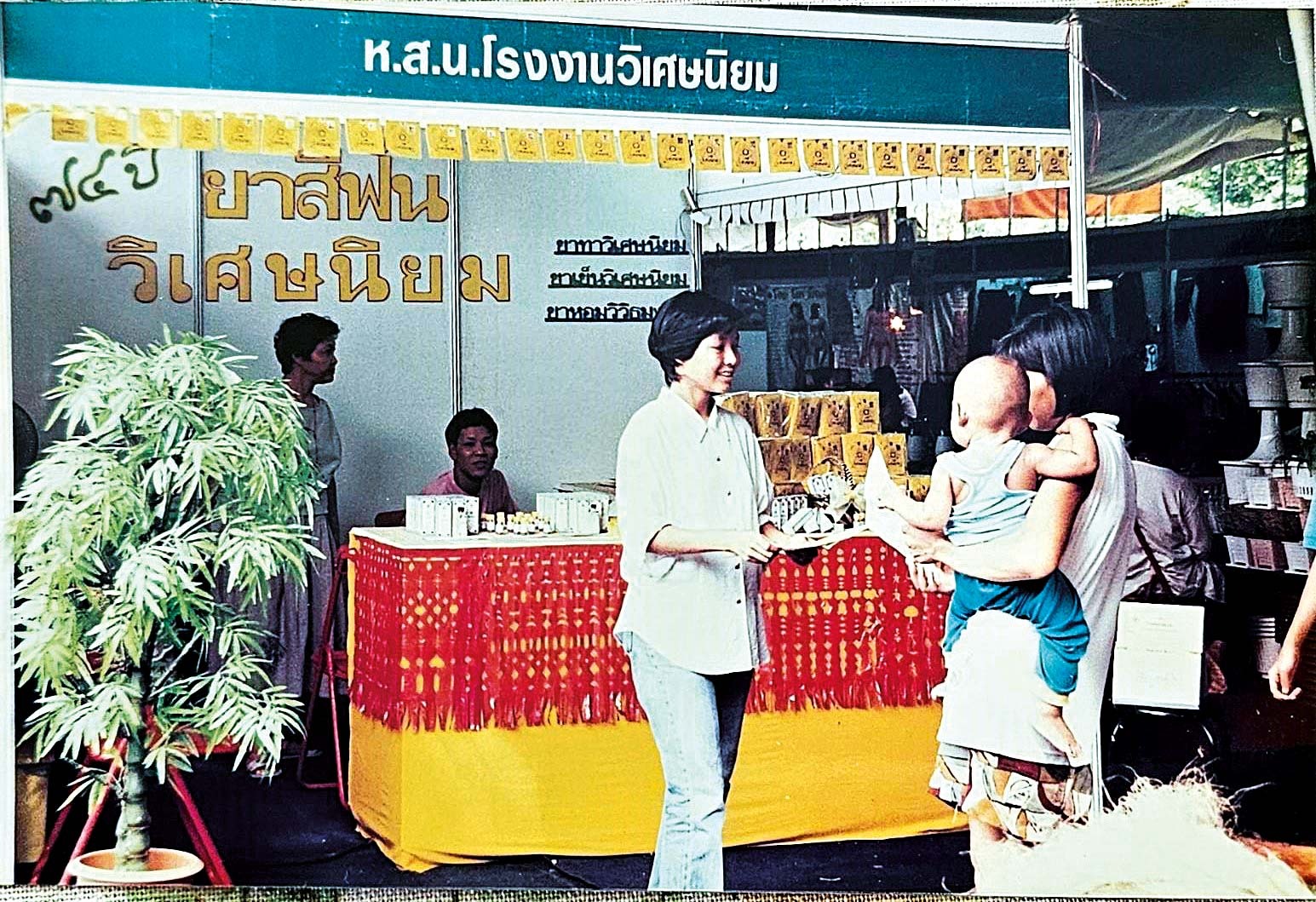 “กิ่ง” ในวัยราว ๑๙ ปี ขณะช่วยคุณแม่แจกใบปลิวโฆษณาผลิตภัณฑ์ในงานออกร้านวิเศษนิยม