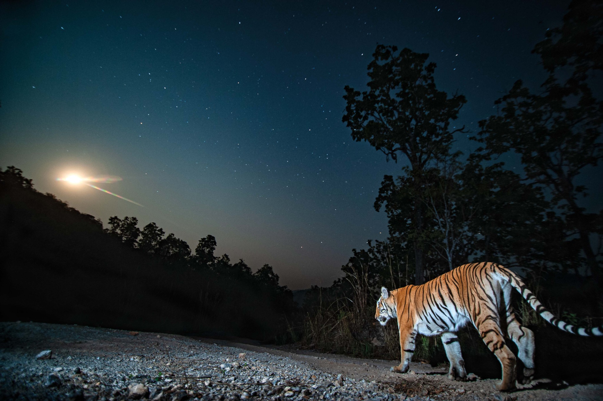 การบันทึกภาพเจ้าป่าในบรรยากาศงดงามด้วยแสงนวลเย็นจากพระจันทร์ที่เพิ่งลอยพ้นเหลี่ยมเขา ดวงดาวยังไม่เร้นเลือนหาย
