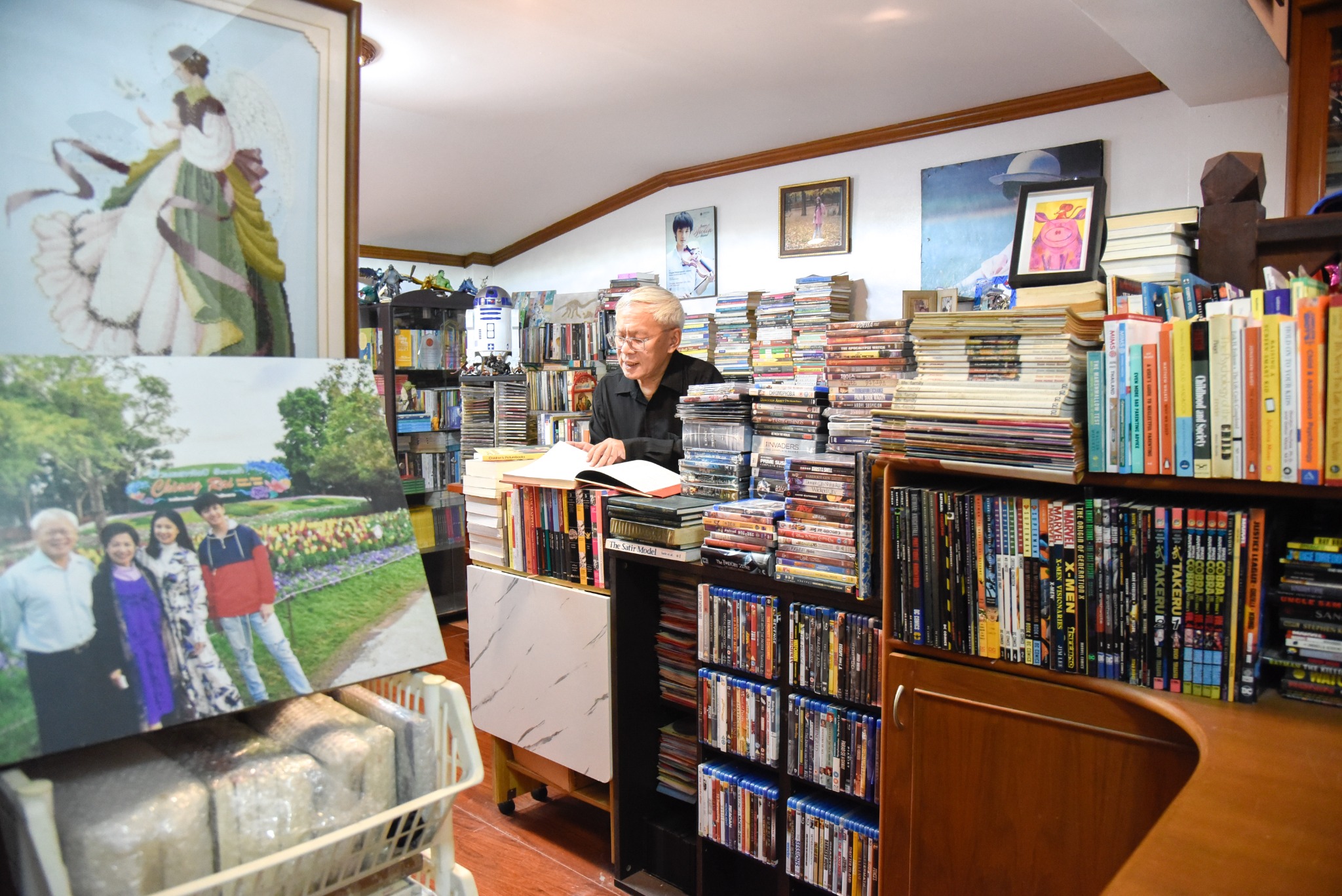 จากบริเวณระเบียงหน้าบ้านชั้นเดียวยกพื้นชานเมืองเชียงรายย่านถนนพ่อขุน คุณหมอประเสริฐนำเข้าไปในห้องหนังสือส่วนตัว ซึ่งเต็มแน่นด้วยหนังสือเล่ม นิตยสาร นิทานประกอบภาพสำหรับเด็ก การ์ตูนต่างประเทศ เอกสารอ้างอิงการ์ตูน ตำราจิตเวชศาสตร์ ตำราพัฒนาการเด็ก นวนิยาย วรรณคดีไทย วรรณกรรมต่างประเทศ และซีดี ดีวีดี บลูเรย์หนัง ซึ่งครองพื้นที่ทั่วห้อง แต่จัดเรียงหมวดหมู่ดูเป็นระเบียบ เจ้าของห้องจำได้แม่นยำว่าเล่มไหนอยู่ตรงไหน
